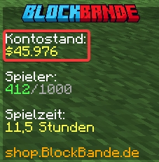 Auf Blockbande und iostein gibt es jeweils eine Währung, die systemseitig identisch zueinander aufgebaut ist. Daher gibt es im Hinblick auf sämtliche Befehle keinerlei Änderungen. Seinen Kontostand kann man im Scoreboard oder mit dem Befehl /money nachschauen.